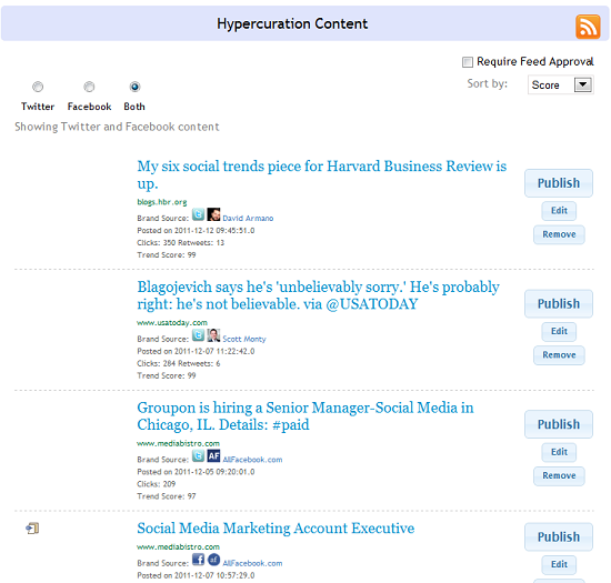 - Hypercuration™: It analyzes Facebook pages you choose, compares them to the audiences of other big pages, and finds the most liked, commented on and retweeted posts by those pages.